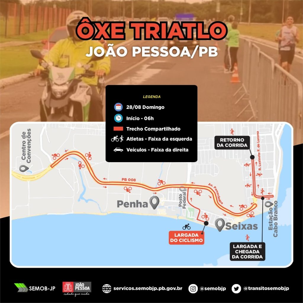 Já no domingo (28), para o Circuito Oxe Triatlo, a operação de trânsito e transporte da Semob-JP estará atuando entre as praias do Seixas, na PB-008 (entre o Centro de Convenções e a Estação Cabo Branco – Ciência, Cultura e Arte) e a Rua Luzinete Formiga (Altiplano/Cabo Branco).