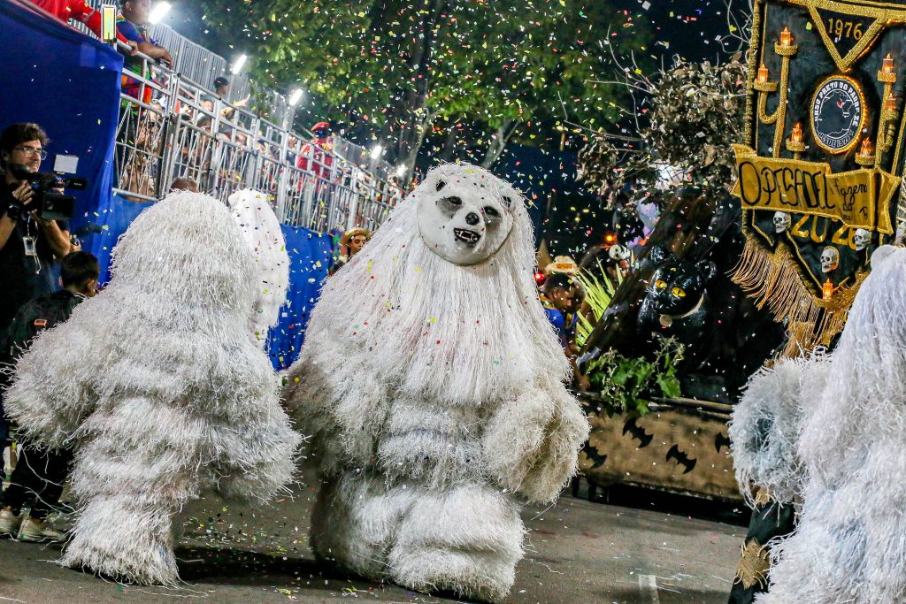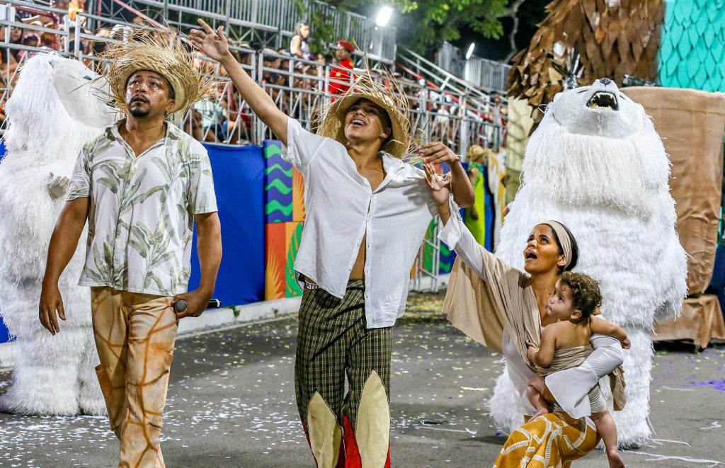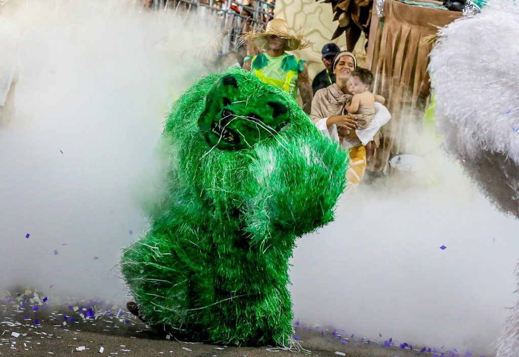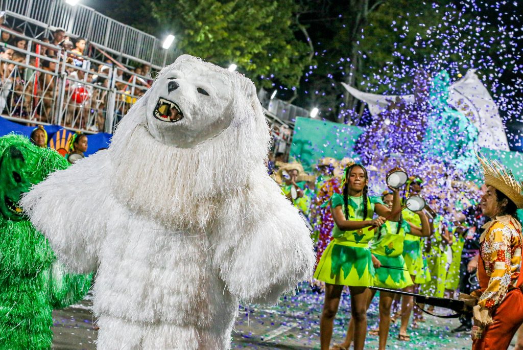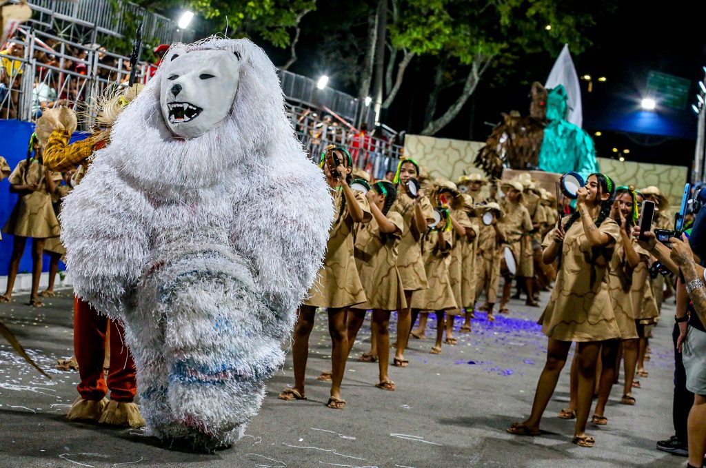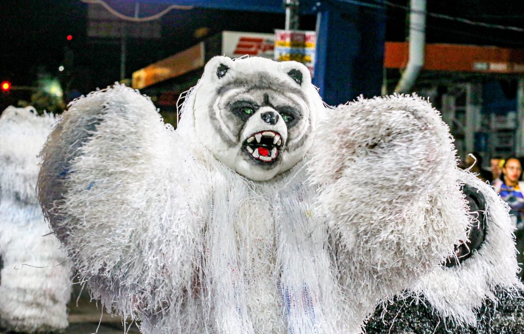 O Urso Folião, com 34 anos de estrada, trouxe a avenida a mensagem do urso sagrado dos povos indígenas. “Enquanto houver esperança a floresta pode renascer. Diga não ao desmatamento”.