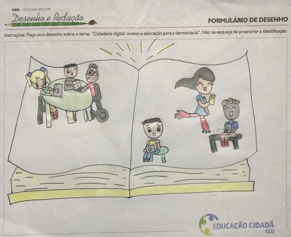 A categoria ‘Desenho’ foi destinada para alunos do 1º ao 5º ano do Ensino Fundamental I. Os desenhos foram feitos de forma individual, autoral e obedecendo ao tema “Cidadania digital: acesso e educação para a democracia”.