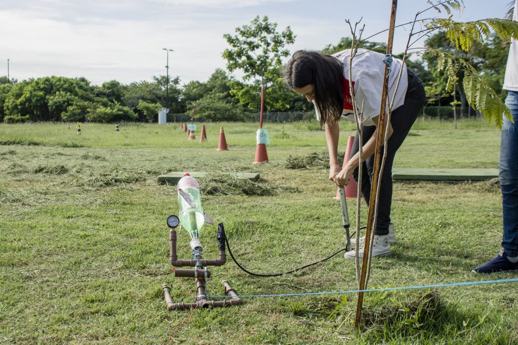 Participaram 50 alunos dos 8º e 9º anos do Ensino Fundamental II. O foguete, feito de garrafas pet e fitas adesivas, foram construídos por várias mãos. Para se classificar para a segunda etapa, o foguete tem que alcançar 100 metros de distância.