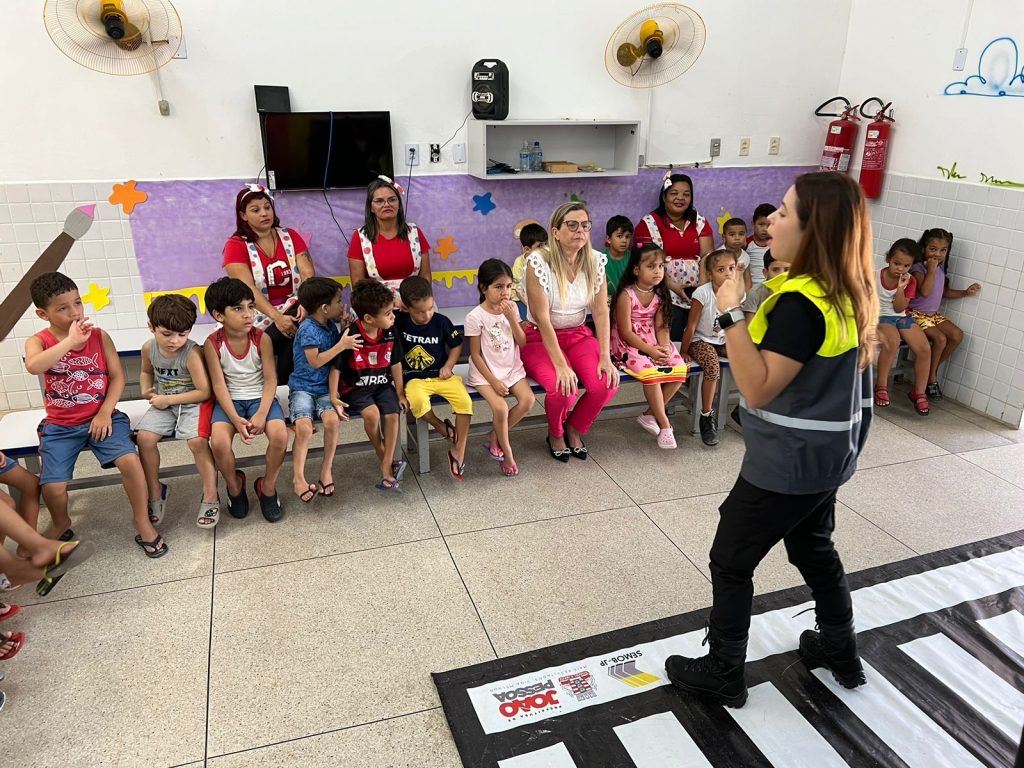 A equipe da Divisão de Educação (Died) da Superintendência Executiva de Mobilidade Urbana de João Pessoa (Semob-JP) esteve na manhã desta sexta-feira (27), no Centro Municipal de Educação Infantil (CMEI) Antônio Varandas de Carvalho, em Manaíra, para uma ação com os alunos, com o objetivo de repassar os ensinamentos de segurança no trânsito.