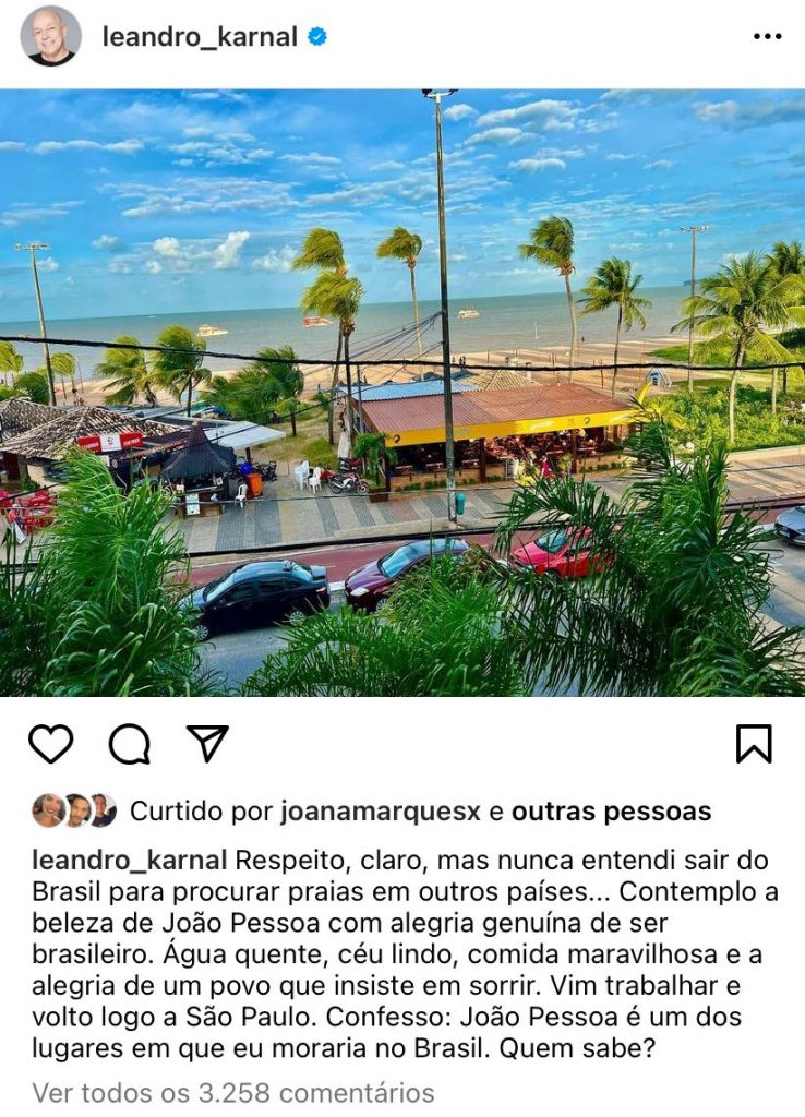 “Respeito, claro, mas nunca entendi sair do Brasil para procurar praias em outros países… Contemplo a beleza de João Pessoa com alegria genuína de ser brasileiro. Água quente, céu lindo, comida maravilhosa e a alegria de um povo que insiste em sorrir. Vim trabalhar e volto logo a São Paulo. Confesso: João Pessoa é um dos lugares que eu moraria no Brasil. Quem sabe?”, escreveu Karnal em sua rede social.