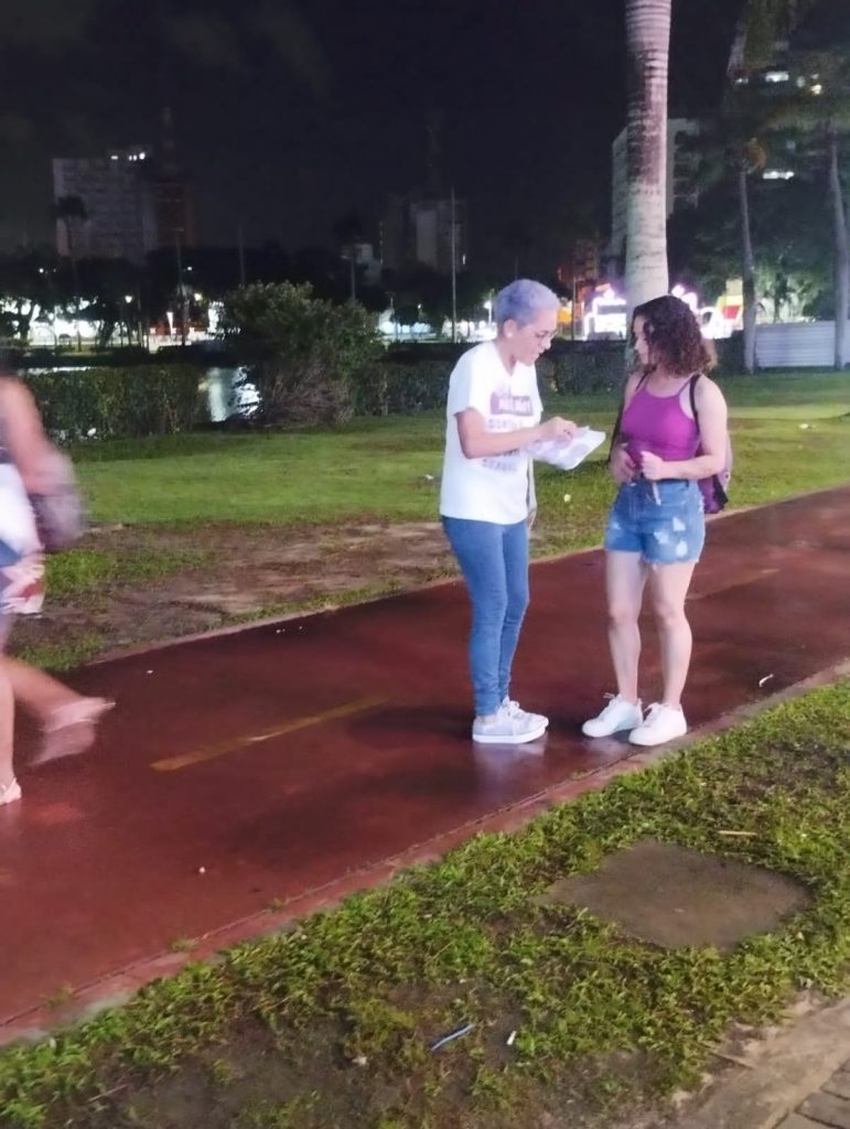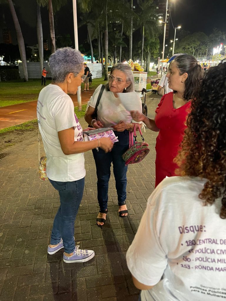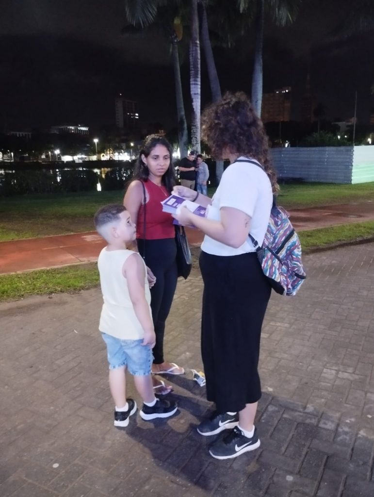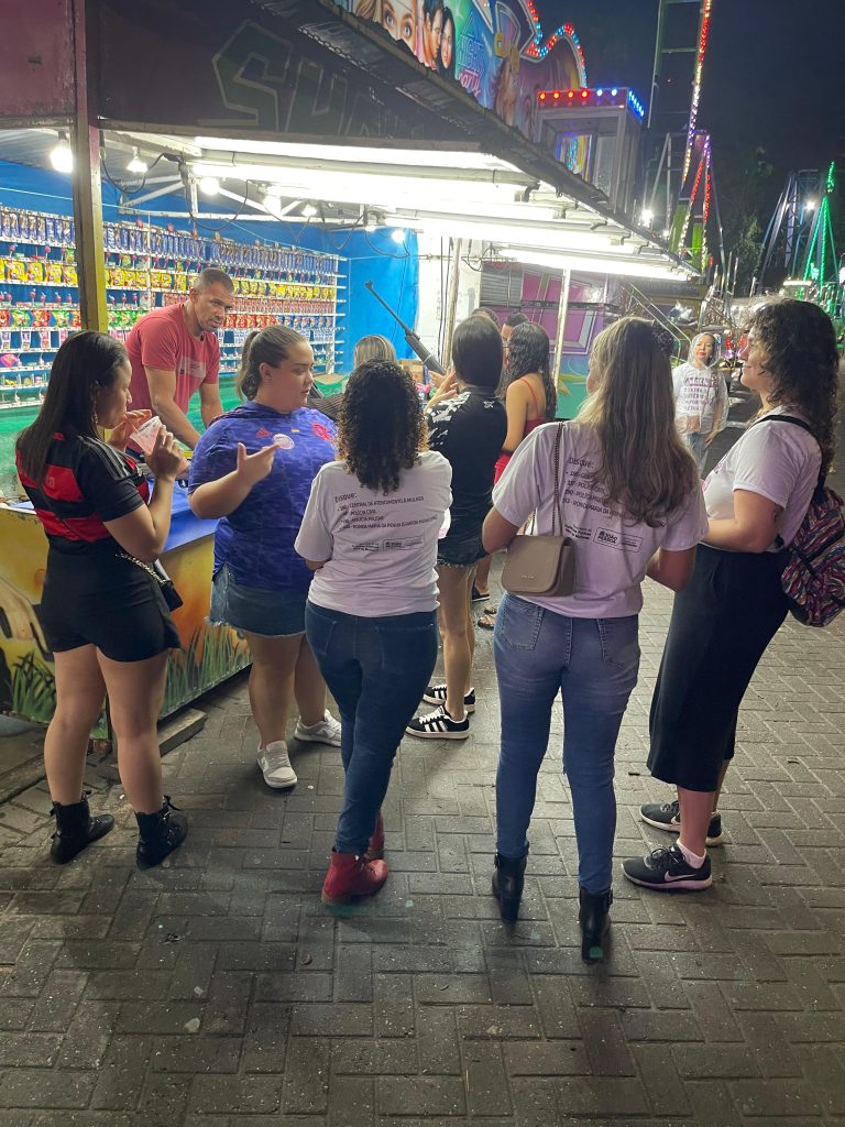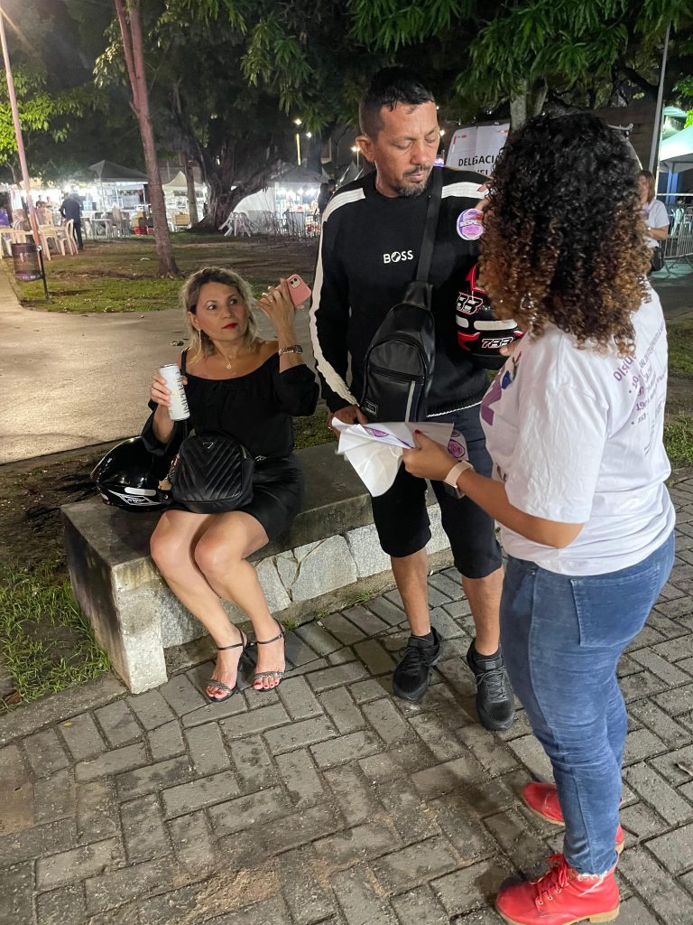 Apoio às mulheres – Buscando sensibilizar a população sobre a gravidade do assédio e importunação sexual, os materiais educativos entregues ao público traziam os números dos canais de denúncia que podem ser acionados caso alguém identifique que uma mulher está sendo vítima de algum desses crimes contra a liberdade sexual.