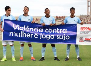 A Prefeitura Municipal de João Pessoa (PMJP), por meio da Secretaria Extraordinária de Políticas Públicas para as Mulheres (SEPPM), esteve presente, neste sábado (12), no Estádio Almeidão para a abertura do Campeonato Paraibano de Futebol. O jogo foi entre os times Botafogo e Perilima, onde o Botafogo vendeu pelo placar de 4×1. Mas o que chamou a atenção dos torcedores foi que os jogadores entraram em campo segurando faixas com mensagens para o fim da violência contra a mulher. O ato faz parte da Campanha ‘Laço Branco – Homens Unidos pelo Fim da Violência Contra a Mulher’, deflagrada no dia 6 de dezembro do ano passado pela SEPPM.