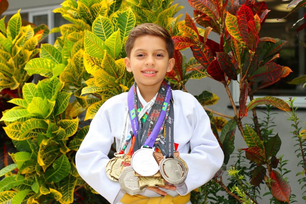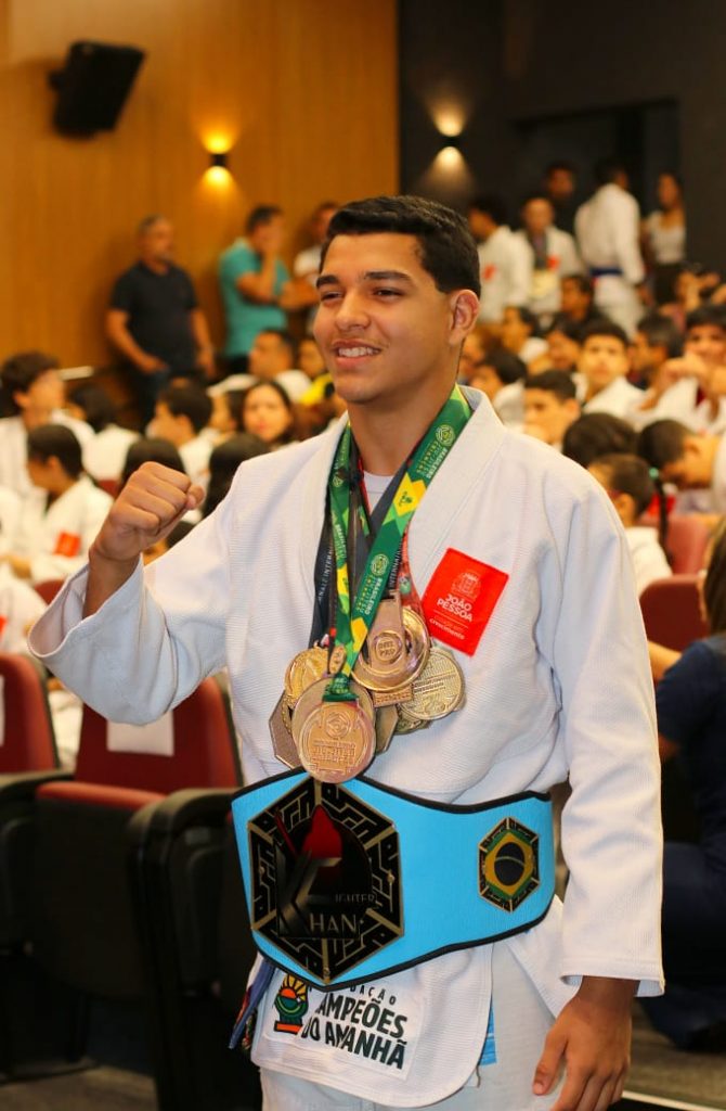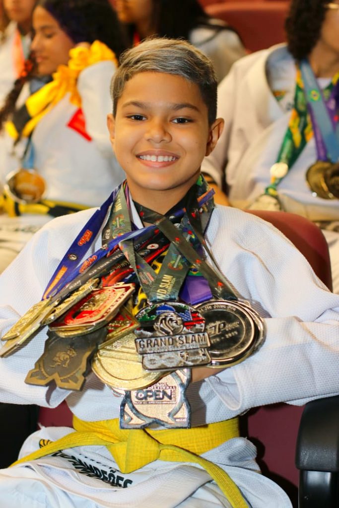 Talento – Antônio Lucas, de 9 anos, possui dezenas de medalhas – mal consegue exibir no peito. Sua mãe, Suênia Nascimento, disse que o menino é apaixonado pelo esporte, já disputou competições até fora da Paraíba. Ela agradeceu o cuidado da Prefeitura – de acolher o filho na Fundação e no apoio, agradecendo o recebimento do quimono.