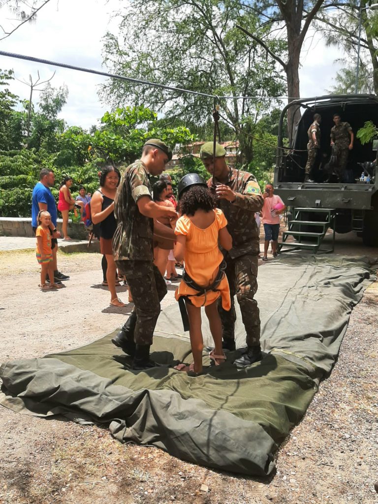 Além das atividades de lazer, as crianças puderam se aventurar em dinâmicas realizadas pelo Exército, que esteve presente com equipamentos e exposições. E ainda participou com brincadeiras de tiroleza,