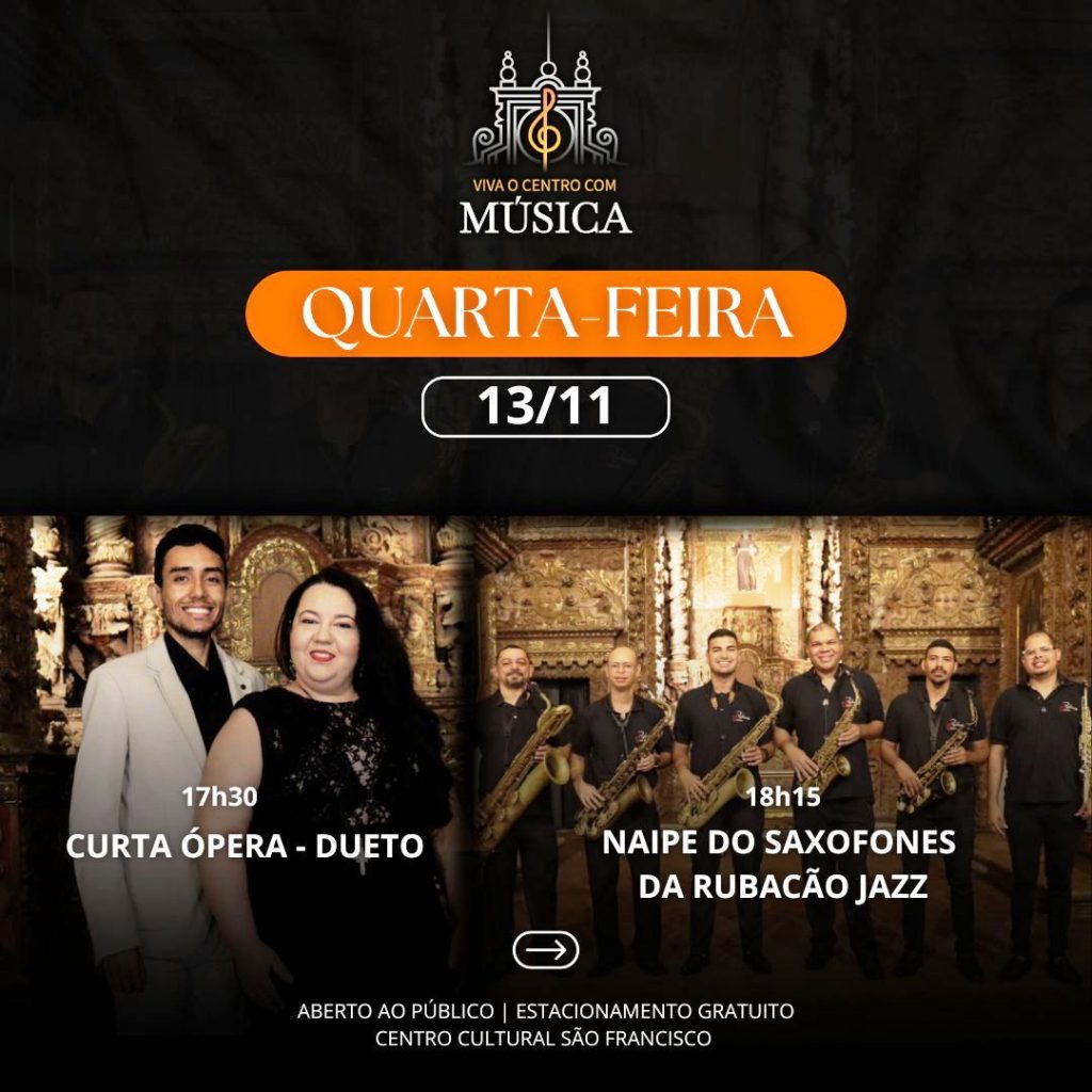 Nesta quarta-feira (13), a programação tem início às 17h30 com o Curta Ópera – Dueto, oferecendo ao público uma seleção de peças clássicas em um formato intimista e acessível. Logo em seguida, às 18h15, será a vez do Naipe de Saxofones da Rubacão Jazz. Com uma performance marcante, o grupo traz um repertório de jazz sofisticado, destacando o talento dos saxofonistas em uma apresentação instrumental envolvente.
