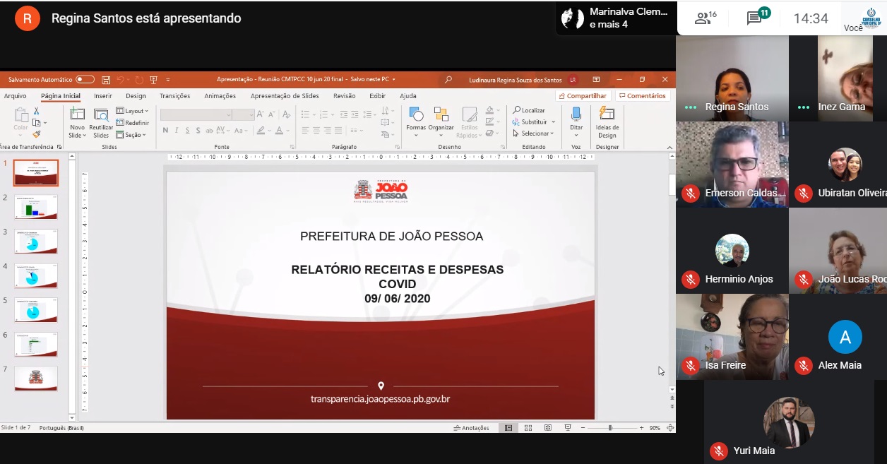 Os conselheiros do Conselho Municipal de Transparência Pública e Combate à Corrupção (CMTPCC) se reuniram, na última quarta-feira (10), por meio de videoconferência, para acompanhar o balanço das contratações emergenciais feitas pela Prefeitura Municipal de João Pessoa (PMJP) durante a pandemia do novo coronavírus.