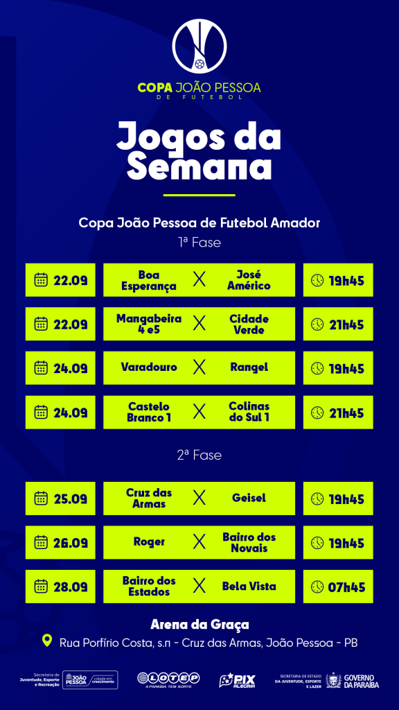 Na Arena da Graça, em Cruz das Armas, na primeira partida, às 19h45, se enfrentam Boa Esperança e José Américo. Em seguida, será a vez do duelo entre Mangabeira 4 e 5 contra Cidade Verde.