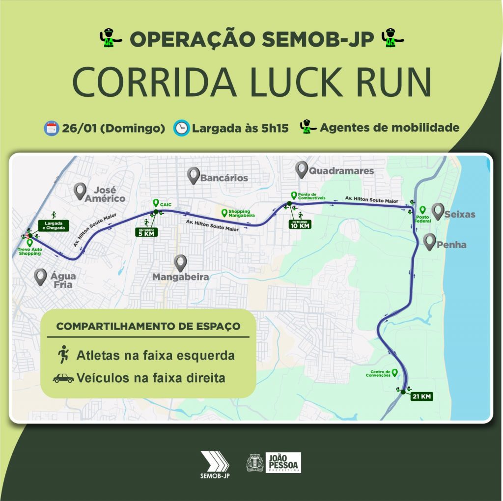 Seguindo a política da Prefeitura de João Pessoa de incentivo às práticas de uma vida saudável, a Superintendência Executiva de Mobilidade Urbana da Capital (Semob-JP) vai garantir a segurança dos participantes da Corrida Luck Run Trevo Folia, bem como a fluidez do tráfego de veículos durante o evento esportivo, que será realizado neste domingo (26), com percursos de 5, 10 e 21 quilômetros, acompanhados de perto por 35 agentes de mobilidade, que estarão estrategicamente distribuídos em toda a extensão dos percursos, a partir das 5h.