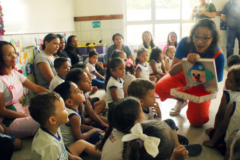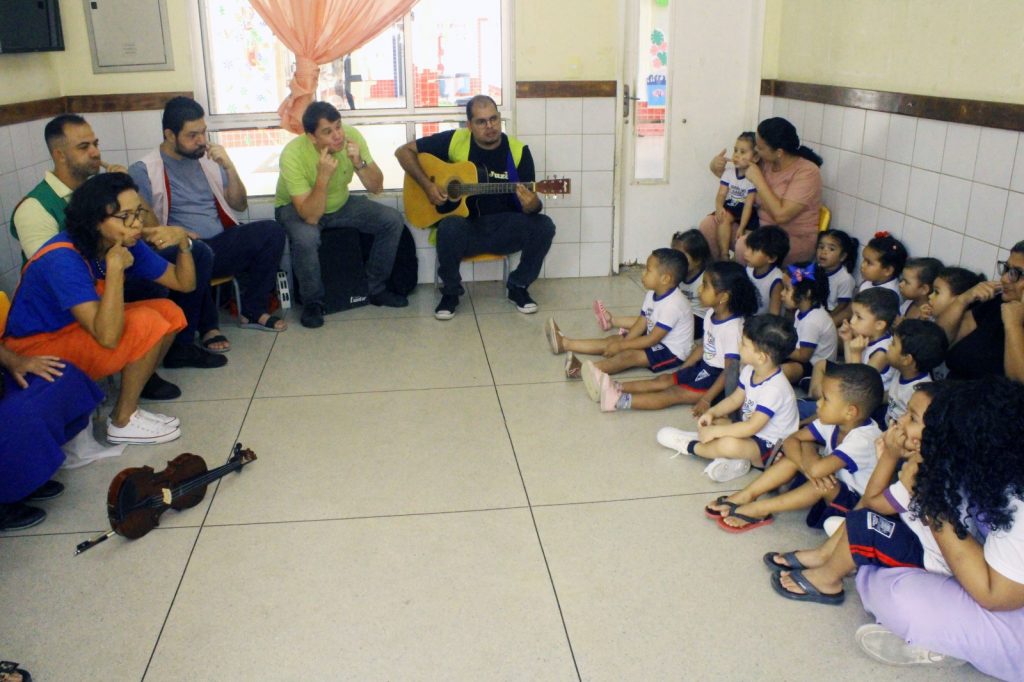 A manhã desta quinta-feira (9) iniciou com atividades musicais para os alunos do Ninho do Saber Fabiana Oliveira Lucena, no Bairro das Indústrias. Dentro das apresentações, os professores de educação musical da Seção de Bandas da Sedec apresentam para as crianças a escuta, a apreciação, o lúdico e a contação de história com música.