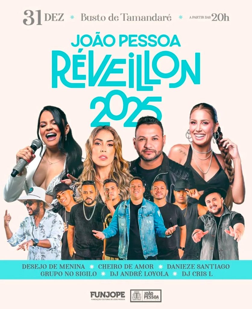A Prefeitura de João Pessoa, por meio da sua Fundação Cultural (Funjope), está nos ajustes finais para o Réveillon na Orla da Capital paraibana. Em clima de alto astral, a festa da virada será comandada, a partir das 20h, por Danieze Santiago, Cheiro de Amor, Desejo de Menina, Grupo No Sigilo e a animação dos DJs Cris L e André Loyola. À meia-noite, serão oito minutos de queima de fogos silenciosos. Em seguida, as atrações seguem agitando o público até o primeiro dia de 2025 amanhecer.