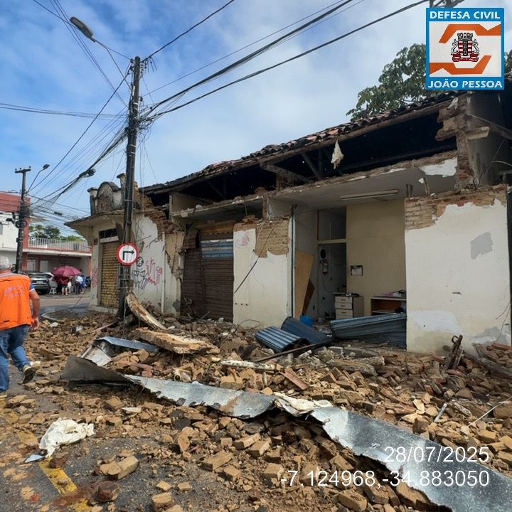 A Coordenadoria Municipal de Proteção e Defesa Civil de João Pessoa (Compdec-JP) interditou, nesta segunda-feira (28), um imóvel, localizado na esquina da Rua Desembargador José Peregrino com a Rua Rodrigues de Aquino, no Centro, após o desabamento da marquise. O prédio estava desocupado e ninguém ficou ferido.