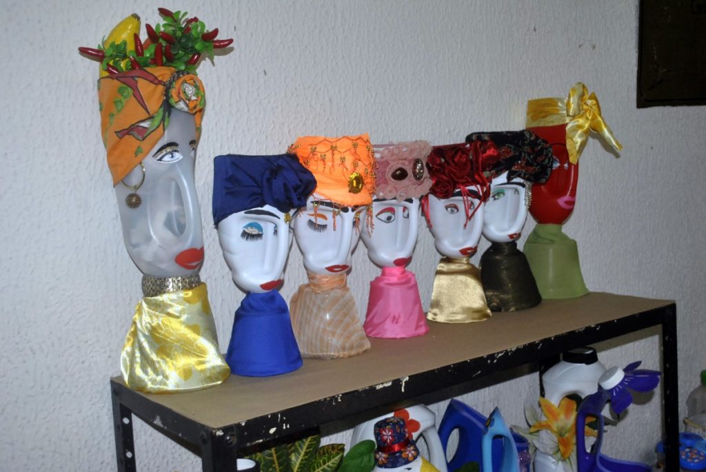 Outros objetos produzidos pelos artesãos são mandala – feita com papel de revista, ou jardim suspenso – com garrafas PET. “É uma questão de criatividade. Com a transformação, o material reciclável vira um objeto de arte”, enfatiza Antônia Souza.
