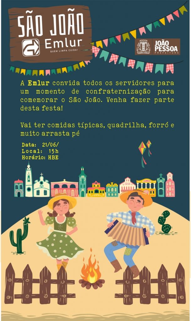 A Autarquia Especial Municipal de Limpeza Urbana (Emlur) realiza, nesta quarta-feira (21), a partir das15h, no Colégio e Curso HBE, no Bairro dos Estados, o São João dos agentes de limpeza e demais servidores da Autarquia.