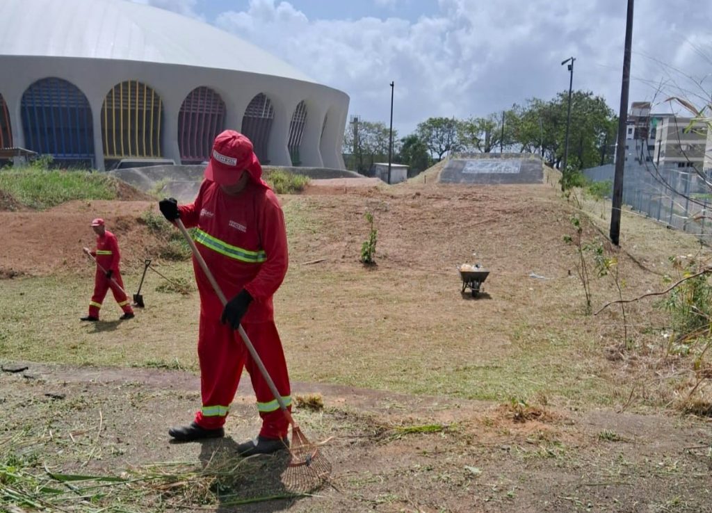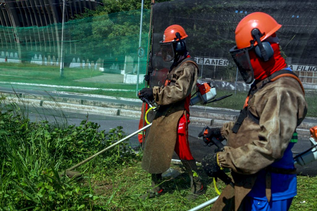 Os agentes da Autarquia Especial Municipal de Limpeza Urbana (Emlur) trabalham nos serviços de roçagem, capinação e pintura de meio-fio no entorno do Ginásio O Ronaldão, nesta quinta-feira (12), que vai sediar, na próxima semana, o Campeonato Brasileiro de Ginástica Artística. Os serviços de zeladoria atendem, ainda, demandas de 10 bairros da Capital.