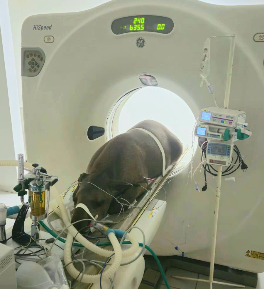 Diante disso, foi realizada uma tomografia computadorizada em dezembro, por meio de uma força-tarefa envolvendo o Cetas de Rondônia, o Cetas da Paraíba, especialistas da clínica Interfisio Vet e veterinários parceiros, como Dr. Jefferson Cordeiro e Dra. Luana Castro, anestesistas. O exame revelou degenerações nos discos intervertebrais das vértebras lombares, além de uma possível displasia coxofemoral. Essas condições explicavam as limitações de mobilidade de Margarida e a necessidade de cuidados contínuos.