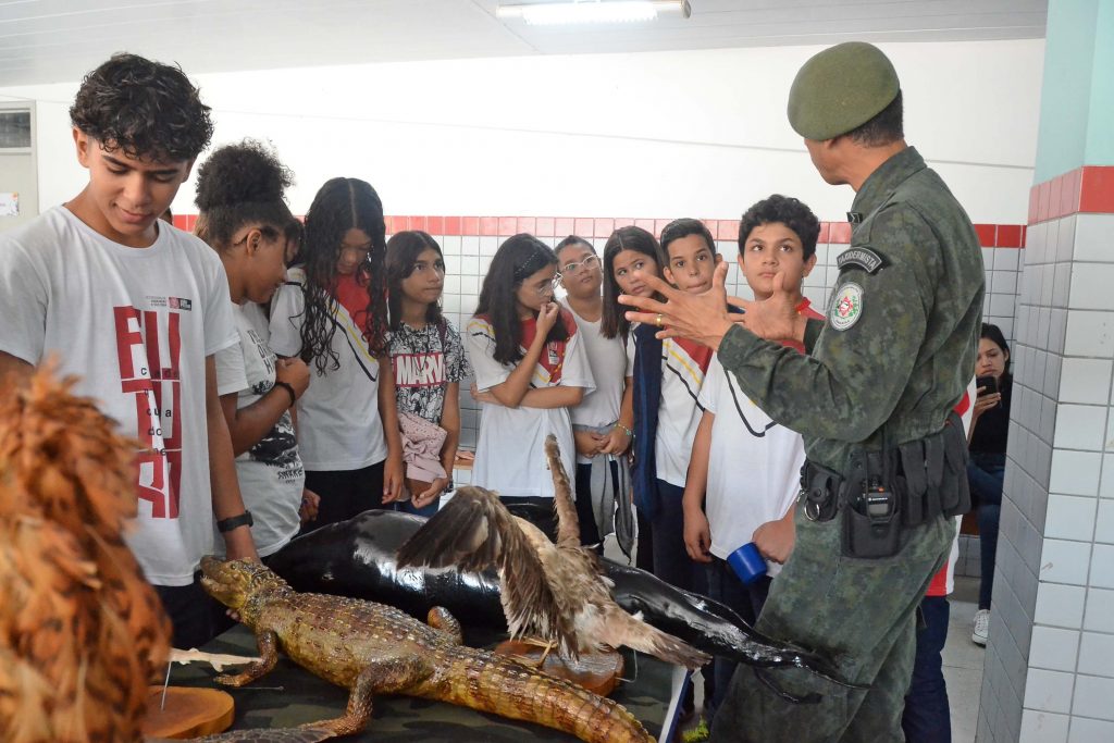 Os profissionais da Polícia Ambiental falaram sobre os cuidados quando aparecem, nos quintais das nossas casas ou mesmo nas ruas, animais como bicho preguiça, jacarés, entre outros. Durante a palestra, as crianças tiveram a oportunidade de interagir com os animais taxidermizados, utilizados pelas equipes da Educação Ambiental da Semam. Também participaram das atividades homens do Canil da Polícia Militar, que demonstraram como os cães são importantes em algumas ações.
