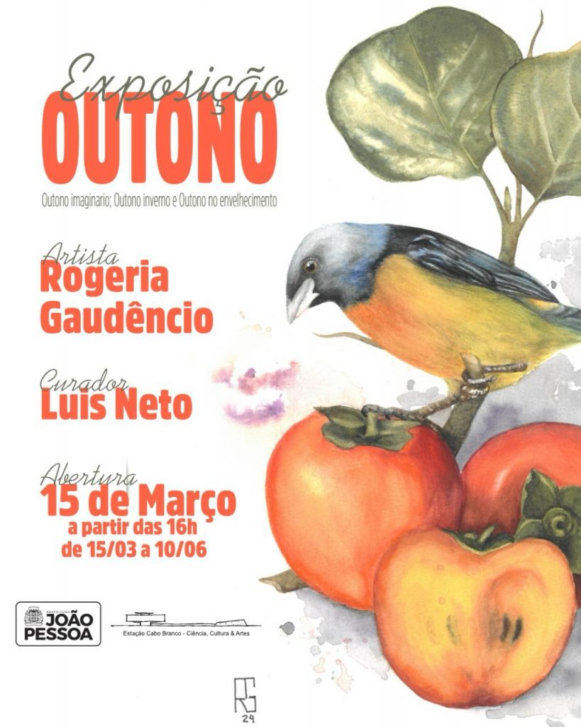 A exposição ‘Outono’, da artista Rogeria Gaudêncio, será aberta ao público a partir deste sábado (15), às 16h, na Estação Cabo Branco – Ciência, Cultura e Artes, no bairro Altiplano. A mostra traz 27 aquarelas que poderão ser vistas no pavimento 1 do Espaço de Arte, até 10 de junho. O local está aberto para visitação de terça a sexta-feira, das 9h às 18h; e sábados e domingos, das 10h às 18h. O acesso é gratuito.