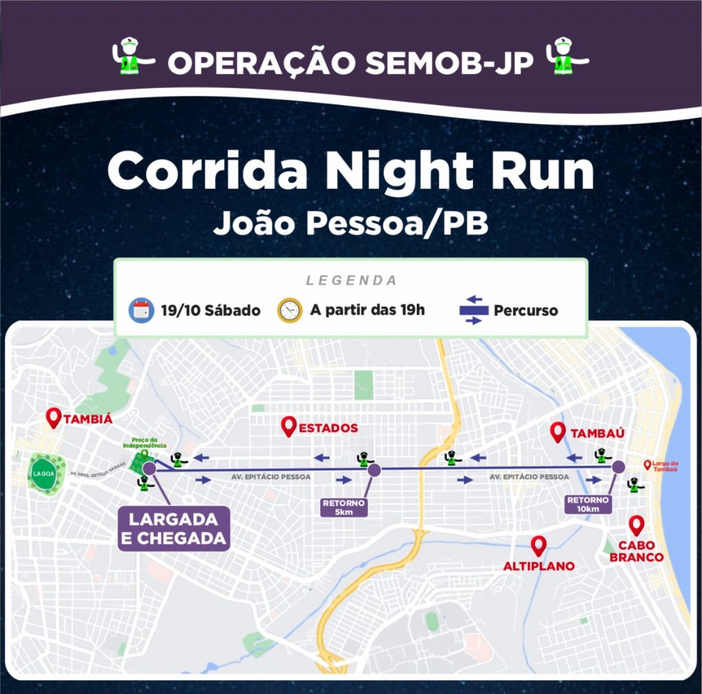 A Superintendência Executiva de Mobilidade Urbana de João Pessoa (Semob-JP) vai dar apoio operacional durante a realização dos eventos esportivos programados para este fim de semana. Neste sábado (19), acontece a Corrida Night Run Missão Apolo e no domingo (20) a Corrida Kumon Pais e Filhos. O objetivo do trabalho da Semob-JP é garantir segurança aos participantes e a fluidez do tráfego de veículos nos trechos de realização dos eventos.