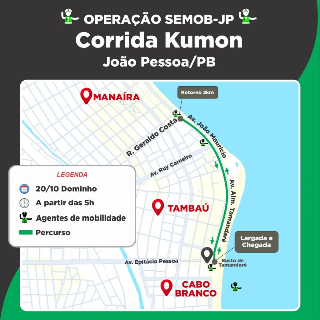 Corrida Kumon Pais e Filhos – Com largada do Busto de Tamandaré, às 5h da manhã, os participantes seguem pela Avenida Almirante Tamandaré, em Tambaú, depois Avenida João Maurício, em Manaíra, retornando da Rua Geraldo Costa, até o Busto de Tamandaré, local de chegada, totalizando três quilômetros de percurso. A organização do evento estima o encerramento às 9h, com a liberação do trajeto para o tráfego de veículos pelos agentes de mobilidade da Semob-JP.