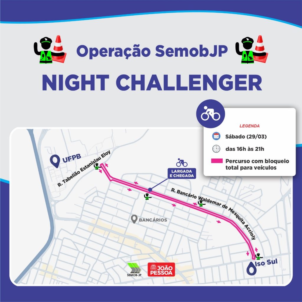No sábado (29), a Federação Paraibana de Ciclismo realizará a primeira etapa do Campeonato Paraibano de Ciclismo, a prova Night Challenger, a partir das 16h, com percurso no Parque das Três Ruas, nos Bancários, seguindo em um circuito aproximado de 6 km e retornando ao mesmo local. Por conta disso, a via será bloqueada para veículos até 21h.