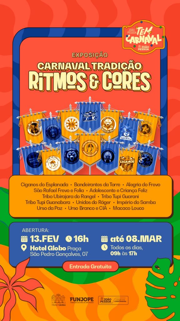 As vésperas do Carnaval 2026 a cultura popular de João Pessoa ganha destaque nesta sexta-feira (13), às 16h, com a abertura da exposição “Carnaval Tradição Ritmos e Cores”, no Hotel Globo, localizado no Centro Histórico da Capital, na Praça São Pedro Gonçalves. A exposição está sendo promovida pela Prefeitura de João Pessoa, através de sua Fundação Cultural (Funjope), e pode ser visitada até o dia 8 de março.