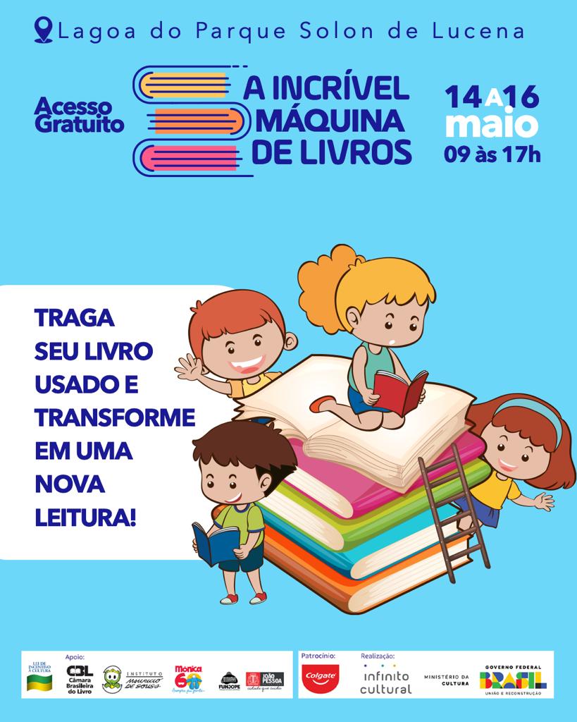 Já pensou como seria bom doar um livro usado e receber um novo em troca? Pois isso será possível a partir deste domingo (14) até a terça-feira (16), dentro da iniciativa ‘A Incrível Máquina de Livros’ que vem percorrendo todo o país. O projeto é realizado pela agência Infinito Cultural e conta com o apoio da Prefeitura de João Pessoa, por meio da sua Fundação Cultural (Funjope). O encontro será no Parque Solon de Lucena, das 9h às 17h.
