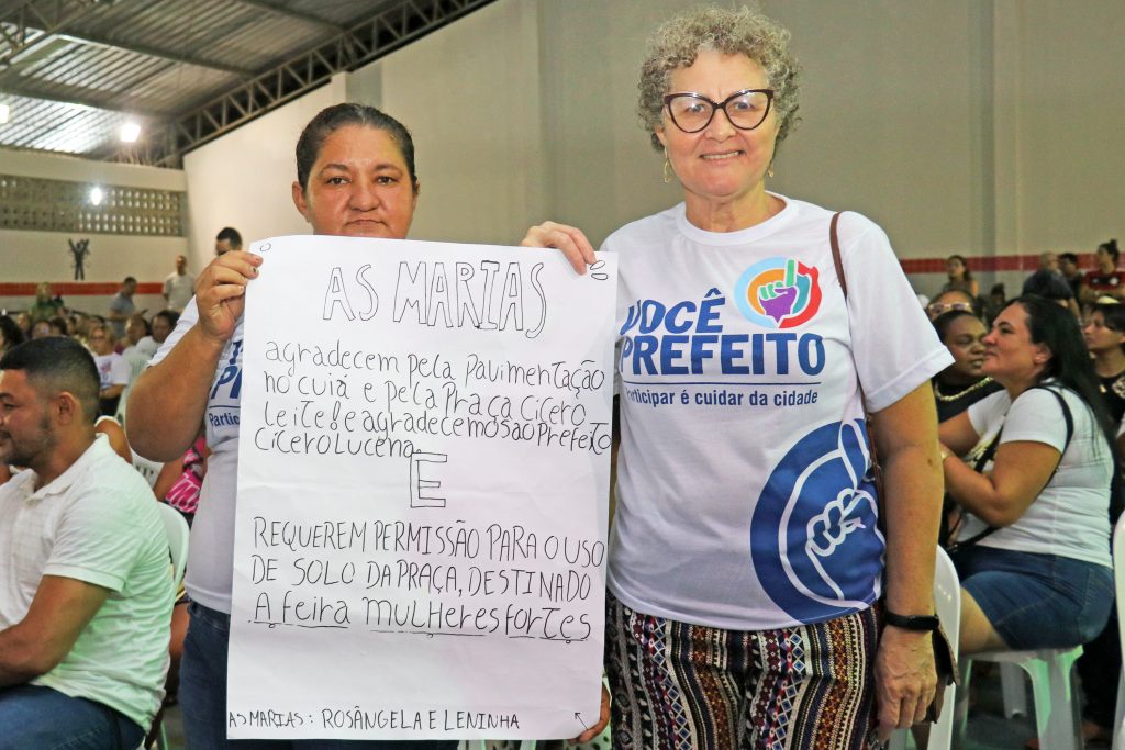 Reivindicações – Representando a 4ª região, Rosangela de Freitas e Josilene Felix (Leninha), conselheiras, levaram um cartaz para agradecer a pavimentação de seis ruas e a construção da Praça Cícero Leite, no Cuiá. Juntas, reivindicaram a construção de uma escola pública para a localidade, justificando que muitas crianças precisam se deslocar para estudar no bairro do Geisel, local considerado distante. Elas pedem, ainda, placas indicativas para o bairro, paradas de ônibus, além de uma permissão do uso do solo da Praça Cícero Leite para a realização da ‘Feira das Mulheres Fortes do Cuiá’. “A gente vai pedindo aos poucos para não assustar”, brinca Rosângela.
