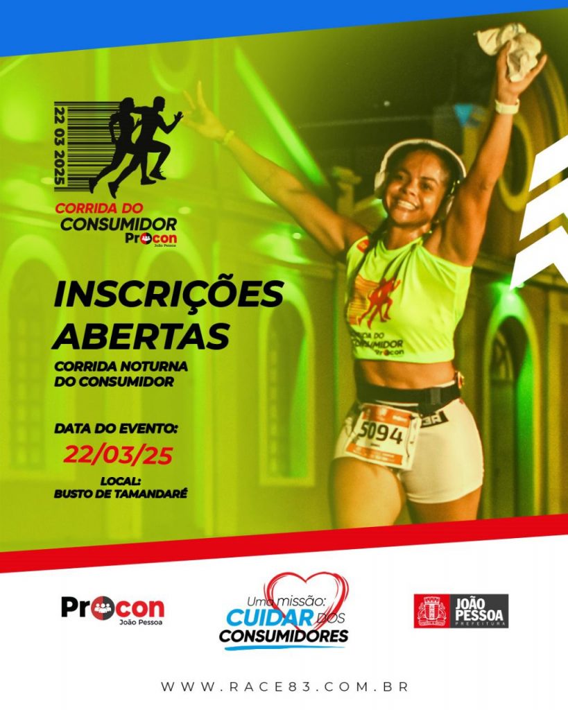 A Corrida do Consumidor 2025, que vai ocorrer no dia 22 de março como parte das comemorações do Dia Mundial do Consumidor, já está com as inscrições abertas, através deste site. A segunda versão do evento esportivo promovido pela Prefeitura de João Pessoa terá percursos de 5 km e 10 km, com saída do Busto de Tamandaré, às 20h30. Serão disputadas três categorias: Geral (masculino e feminino), PCD Cadeirante e PCD Não Cadeirante.