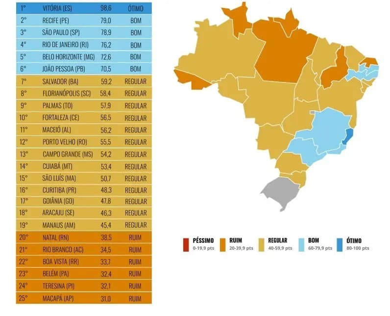 Vitória, no Espírito Santo, lidera o ranking com 98,6 pontos e foi a única capital brasileira a alcançar uma classificação “ótima”. Treze capitais tiveram nota “regular” e seis foram classificadas como “ruim” (Natal, Boa Vista, Rio Branco, Belém, Teresina e Macapá).