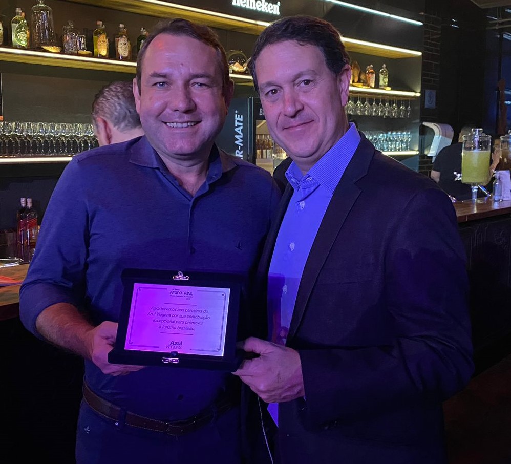 O secretário de Turismo, Daniel Rodrigues, recebeu a placa das mãos de Daniel Bicudo, diretor de Marketing e Negócios da Azul Linhas Aéreas. O evento aconteceu na noite da quarta-feira (17), no encerramento do WTM Latin América, feira de Turismo que reuniu mais de 27 mil profissionais do Turismo nacional e internacional, em São Paulo.