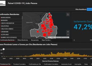 O ‘Painel Covid-19’ também mostra que João Pessoa conta com 4.018 casos prováveis, 856 descartados e 663 recuperados. Os números detalham ainda que 279 pessoas estão hospitalizadas por Covid-19, sendo 129 em Unidades de Terapia Intensiva (UTI). A Secretaria Municipal de Saúde (SMS) também contabiliza 54 óbitos por Coronavírus. Todos os dados são atualizados diariamente na plataforma web que pode ser acessada por qualquer cidadão gratuitamente pelo link: https://experience.arcgis.com/experience/d76ba516389d4e83b9a778d266cac5c1/.