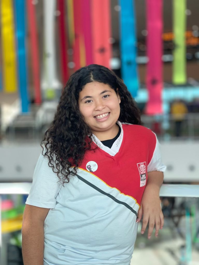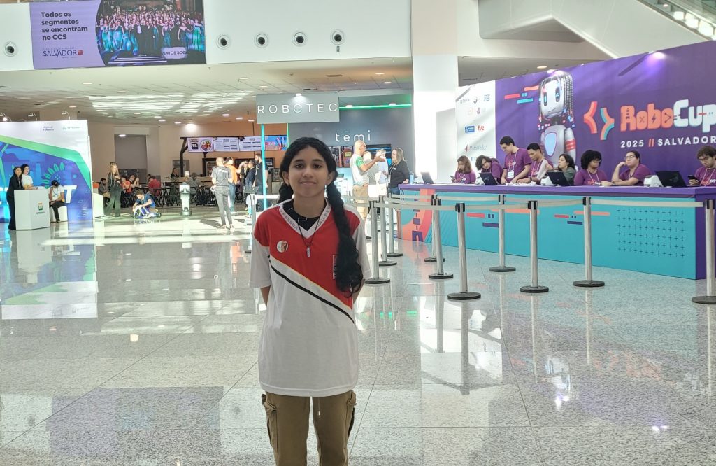 Bianca Hellen, 7º ano, da Escola Santa Ângela: “Vou guardar para sempre no meu coração. Está sendo uma honra participar da RoboCup 2025 e conhecer pessoas de tantos lugares”.