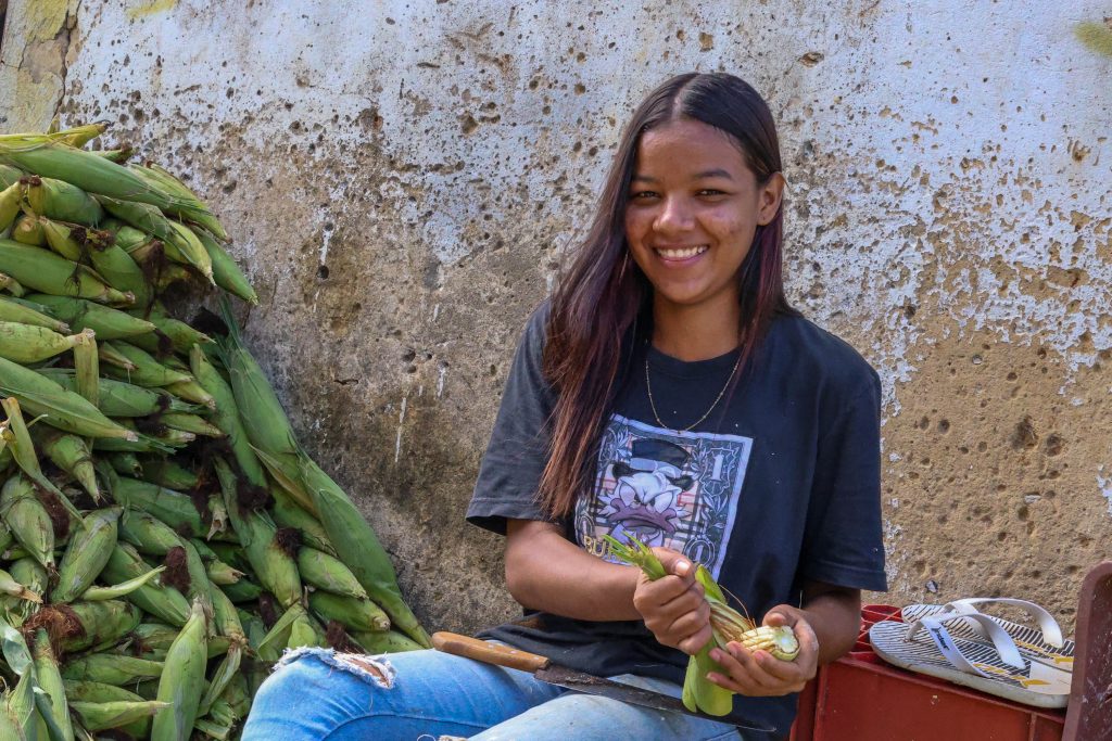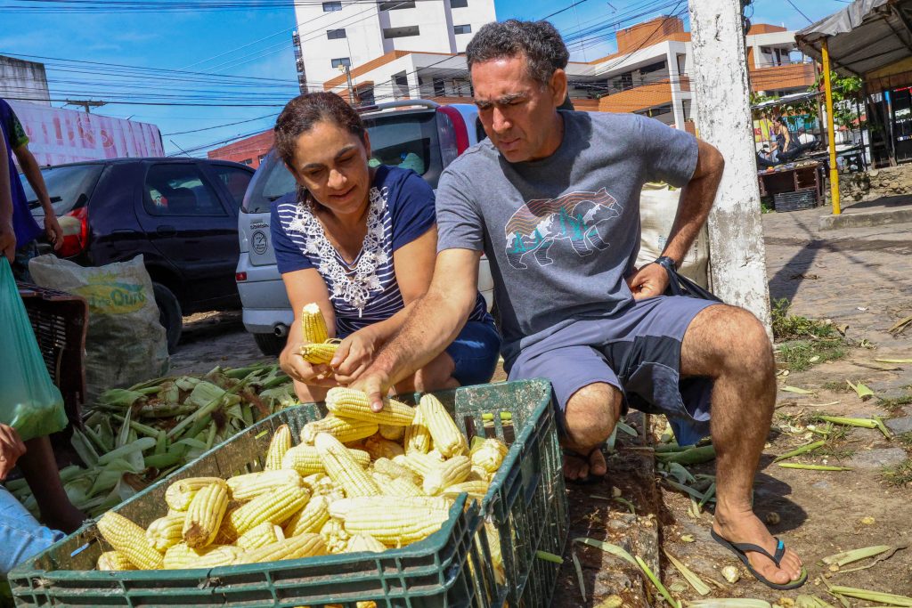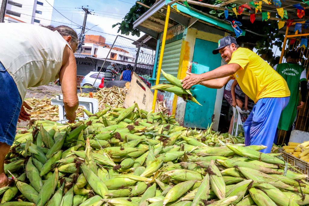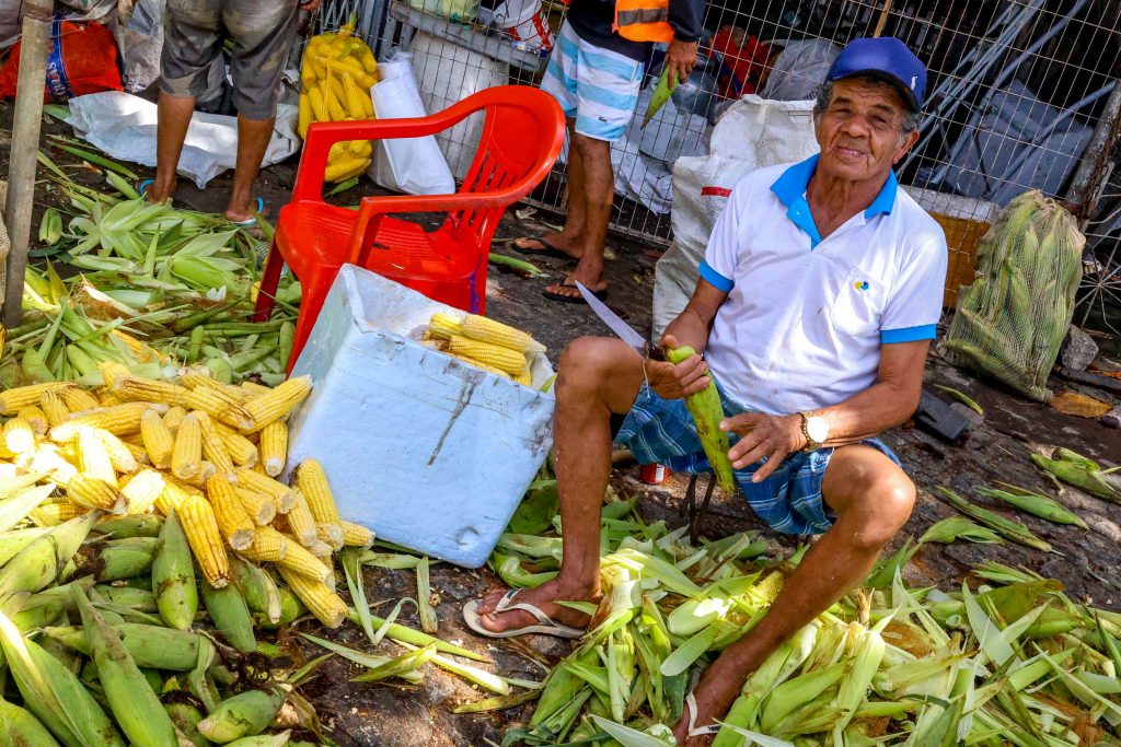 O fervor dos mercados e a arte das quituteiras – No Mercado Central, o movimento é intenso. Seu João Sinésio, vendedor há 30 anos, trabalha até de madrugada. “Teve dia que sai daqui às três horas da manhã. Todo mundo quer milho: para assar, para vender, para fazer doces”, frisou. O preço, segundo ele, segue a lei da oferta: “A mão era R$ 50, agora está R$ 60”.