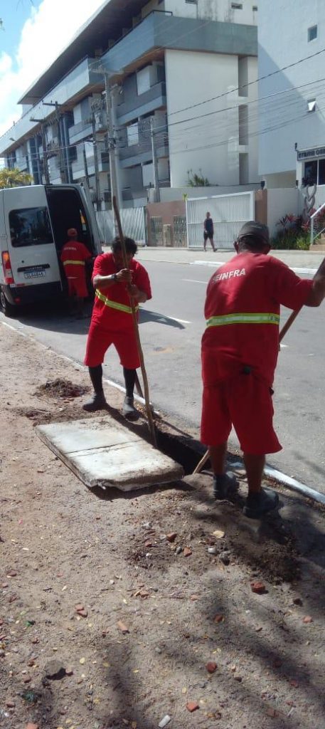 Os trabalhos na rede de drenagem em execução são limpeza de galerias com remoção de entulhos em Cruz das Armas, Varadouro, Mangabeira e Bairro das Indústrias.