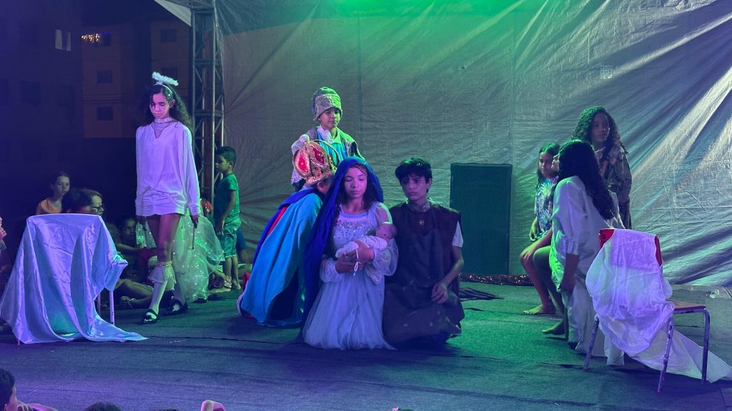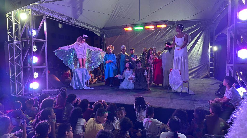O espetáculo foi encenado por jovens moradores da própria comunidade, do Residencial Vista do Verde e da Escola Anayde Beiriz, no Bairro das Indústrias, que fazem parte do Projeto Arte Cultura Florescer, mantido pela Semhab. A direção do espetáculo foi da teatróloga Letícia Rodrigues, que resumiu a história do Auto de Natal como sendo “um encontro de fé, afeto e esperança, em que a luz do Menino Jesus renasce em cada gesto e em cada olhar, espalhando entre as pessoas o espírito do Natal”, explicou. A teatróloga reforçou que “o Auto de Natal – ‘Os Anjos Anunciam uma Vista Alegre do Céu’, tem uma ligação muito forte com a própria comunidade”, disse.
