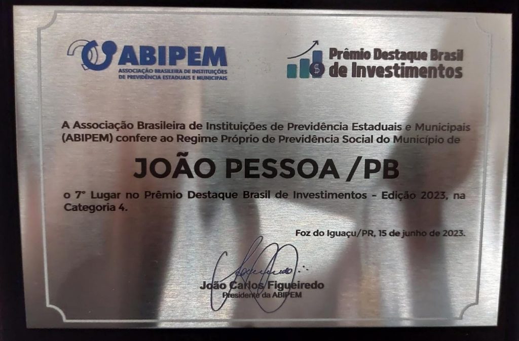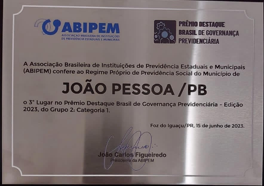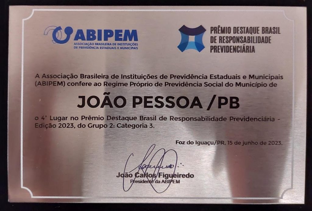 Outras premiações – Em 23 de maio de 2023, o IPM-JP conquistou o 4º lugar na V edição do Prêmio Destaque Brasil de Responsabilidade Previdenciária da Associação Brasileira de Instituições de Previdência Estaduais e Municipais, a maior associação de RPPSs Estaduais e Municipais do Brasil, na categoria municípios com até 10.000 beneficiários. Outra premiação garantida pelo IPM-JP foi a de 3º lugar no Prêmio Destaque Brasil de Governança Previdenciária.