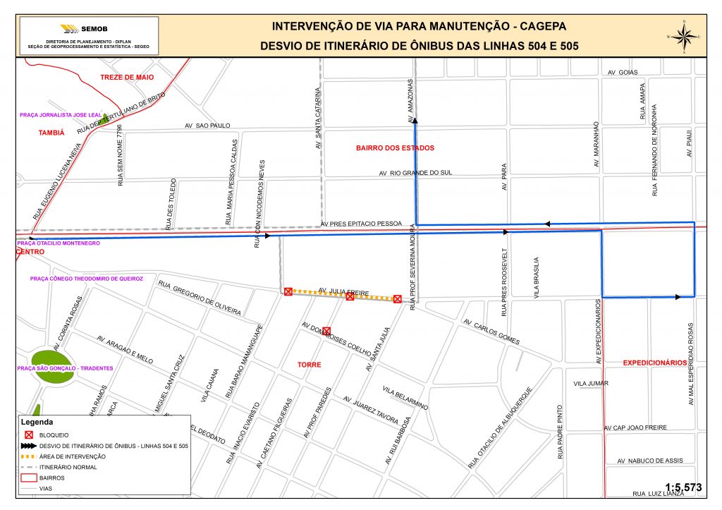 Desta quarta-feira (4) até o próximo dia 11, o trecho da Av. Júlia Freire, compreendido da Av. Caetano Filgueiras à Rua Professora Severina Moura, será bloqueado para continuação de obras da Cagepa para expansão da rede de abastecimento. Também haverá bloqueios na Av. Júlia Freire com Av. Barão de Mamanguape e Av. Caetano Filgueiras com Av. Dom Moisés Coelho, ficando o acesso restrito aos moradores e pessoas que trabalham nas empresas localizadas nesses trechos.