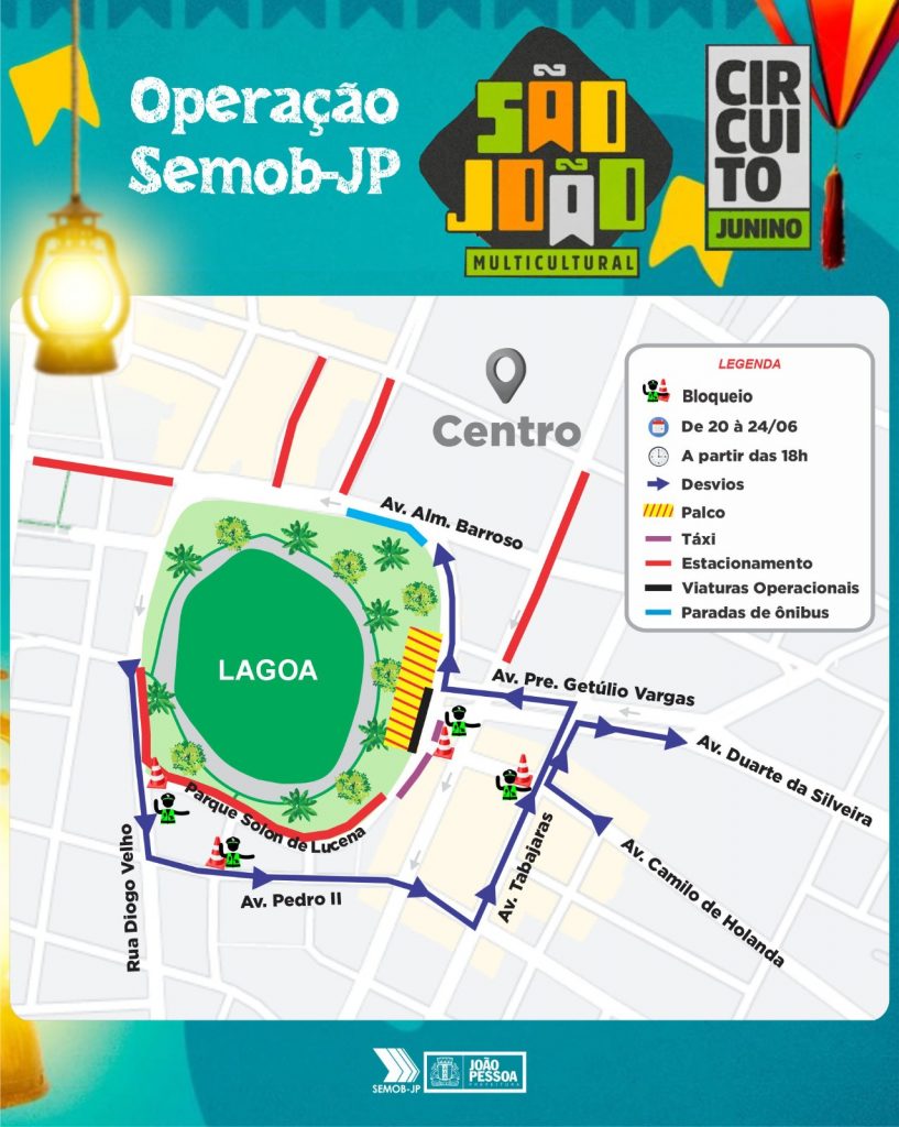 Durante a realização do São Multicultural, promovido pela Prefeitura de João Pessoa, através de sua Fundação Cultural (Funjope), entre os dias 20 e 24 de junho, a Superintendência Executiva dê Mobilidade Urbana (Semob-JP) estará com uma operação especial de trânsito e transporte no entorno do Parque Solon de Lucena (Lagoa), local escolhido para sediar o grande evento junino da Capital.