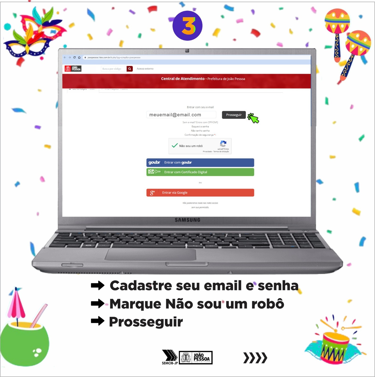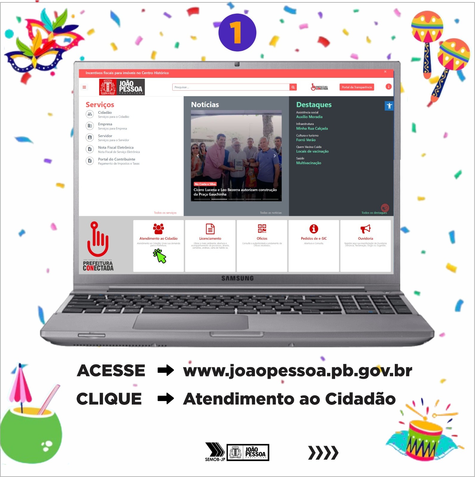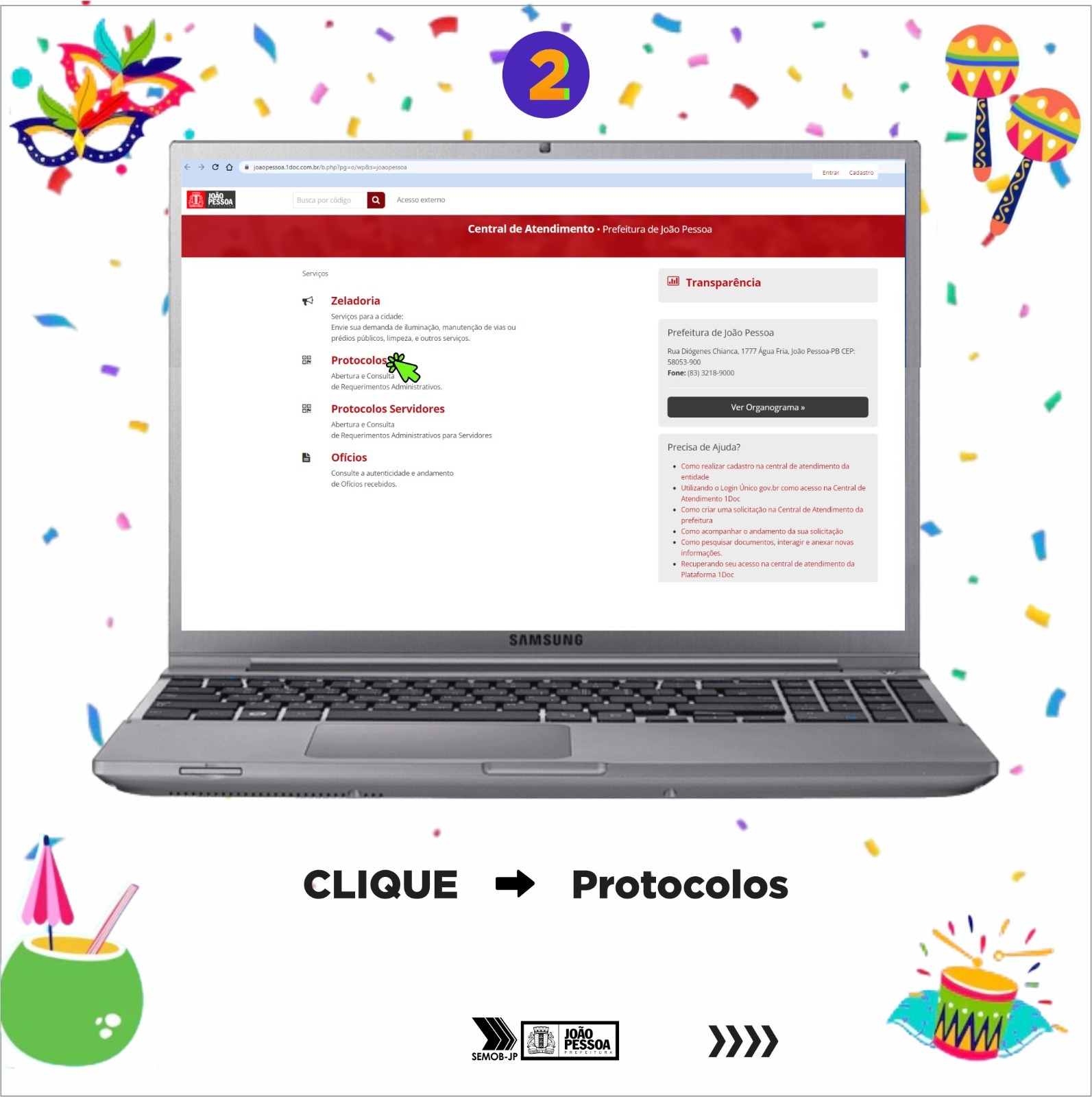 Passo a passo – O interessado em solicitar a autorização de realização do desfile do bloco carnavalesco deve primeiro acessar o site da Prefeitura, ir até a área Prefeitura Conectada, depois clicar em ‘Atendimento ao Cidadão’, ‘Protocolos’, cadastrar o usuário (caso ainda não possua), no campo ‘Assunto’, digitar: SEMOB Eventos Carnavalescos; no campo ‘Descrição’, digitar apenas: nome do bloco e a data pretendida; anexar os documentos necessários e protocolizar. O mesmo passo a passo deverá ser seguido no aplicativo ‘João Pessoa na Palma da Mão’, caso o interessado prefira utilizar esta modalidade.