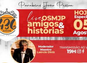A Orquestra Sinfônica Municipal de João Pessoa (OSMJP) preparou uma live especial para comemorar os 436 anos da cidade de João Pessoa. A série ‘Amigos & Histórias’, que tem um convidado a cada semana, vai trazer seis personalidades para falar sobre a Capital paraibana. O bate papo começa às 19h desta quinta-feira (05) e será transmitido pelas redes sociais da Orquestra – @orquestra.smjp, no Instagram, e Facebook – facebook.com/osmjp.