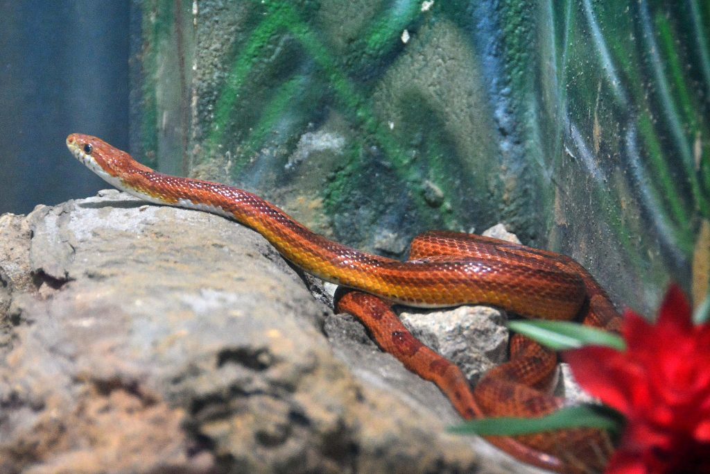 A Panterophis guttatus, mais conhecida como Corn snake ou cobra do milho, é uma espécie originária do Sudeste dos Estados Unidos. “São animais geralmente dóceis, que não apresentam a dentição inoculação de veneno. Elas se alimentam de ratos e camundongos”, explica a bióloga.