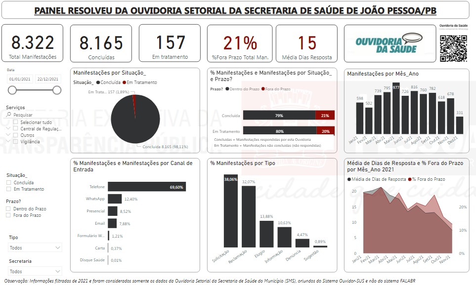 A Ouvidoria da Secretaria Municipal da Saúde de João Pessoa formalizou 8.322 demandas neste ano através do Sistema Ouvidor SUS. Do total de manifestações, 98,11% foram concluídas. O principal canal de atendimento continua sendo através do telefone 160, totalizando 69% das solicitações ao órgão, sendo a maioria delas em relação às informações sobre a vacinação da Covid-19. As manifestações de elogios têm subido ano a ano, e este ano totalizou 1.150 demandas, resultando em 14% do total.