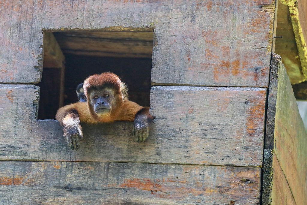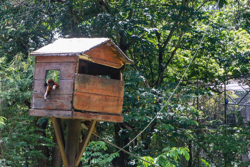 “Nós temos a área de mata onde existem troncos caídos, temos a marcenaria que usamos para construir esses espaços, como casinhas, rampas, nichos e usamos também vários recursos que seriam jogados no lixo, a exemplo de pneus. Pegamos esses pneus, fazemos a higienização, as vezes damos uma pintura e vira um brinquedo para que um primata possa pular”. Segundo ela, além dos troncos e madeira serradas, são usadas tiras de borracha, cordas, canos PVC, entre outros materiais.