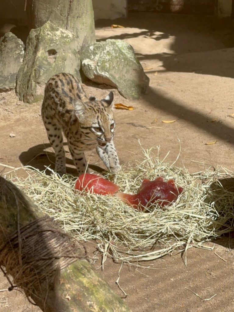 Durante a atividade, os recintos ganharam itens inspirados no Dia das Bruxas, como abóboras, caixas e outros elementos decorados de acordo com a data comemorativa, recheados de alimentos, especialmente preparados para cada espécie. A proposta foi estimular os sentidos dos animais: olfato, visão e paladar, incentivando comportamentos naturais de exploração, caça e curiosidade.