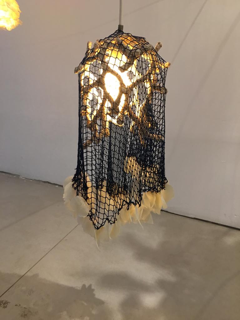 Tipologias – As peças criadas para a coleção Litoral foram divididas, basicamente, em três grupos: o primeiro, reunindo artes feitas com cerâmica, couro e reciclagem de metal; o segundo, com crochê, macramê, tricô, bordado e patchwork; e o terceiro, com reciclados e resíduos do mar, conchas e mariscos – de onde nasceu a luminária. Esse último grupo foi orientado, durante a Oficina, pela designer Laila Assef.
