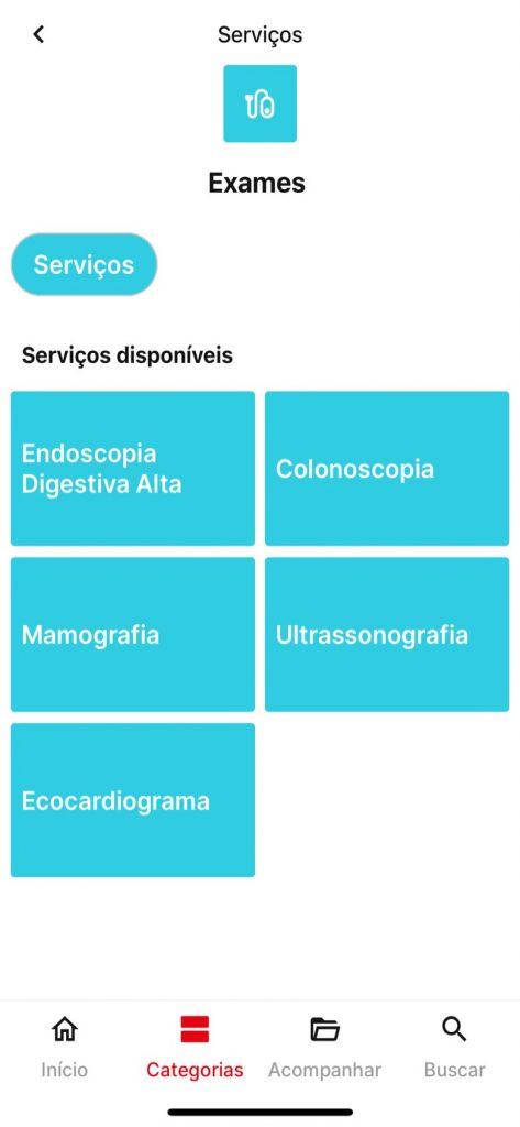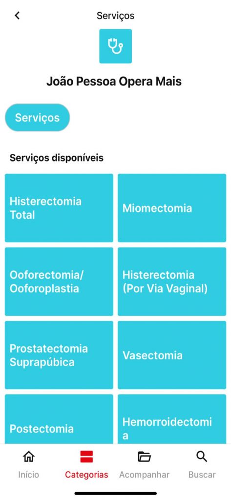 Podem ser solicitados através do app procedimentos como histerectomia total, miomectomia, ooforectomia/ooforoplastia, histerectomia (via vaginal), prostatectomia suprapúbica, vasectomia, postectomia, hemorroidectomia, colecistectomia, hernioplastias, nefrolitomia e laqueadura tubária. Para ter acesso tanto aos exames quanto às cirurgias, é preciso preencher os dados solicitados dentro do aplicativo e anexar a requisição médica.