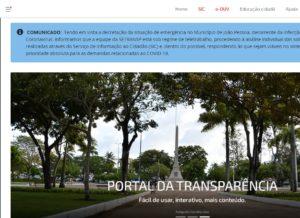 O Portal da Transparência (transparencia.joaopessoa.pb.gov.br) da Prefeitura Municipal de João Pessoa (PMJP) está reunindo informações sobre as doações recebidas e realizadas em relação ao combate à Covid-19. Esta é mais uma novidade do portal que é considerado um dos mais eficientes do Brasil. No Portal da Transparência, já existem as seguintes informações relacionadas ao combate ao novo coronavírus: monitoramento dos casos, receitas, despesas, licitações, contratos, orientações normativas, legislação, recomendações, solicitações, relatórios, ações de transparência e glossário Covid-19.