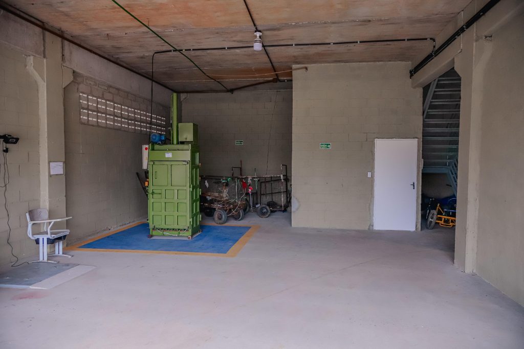 O galpão ainda tem reaproveitamento da água, baias para a separação da coleta por tipo de produto, exemplo plástico, ferro, alumínio – cada uma para atender um tipo de material que vai ser reciclado. Bancada para separação, de triagem, elevador para cadeirantes, acessibilidade PCD. A estrutura ainda conta com escada, escritório separado da área de trabalho, refeitório separado da área para manter a higiene e a segurança alimentar.